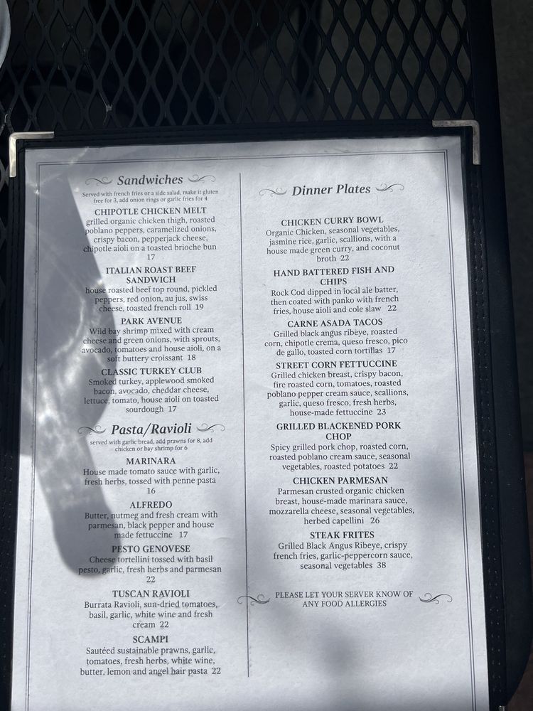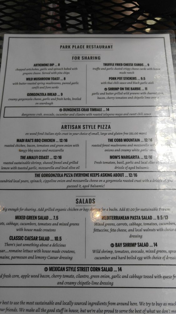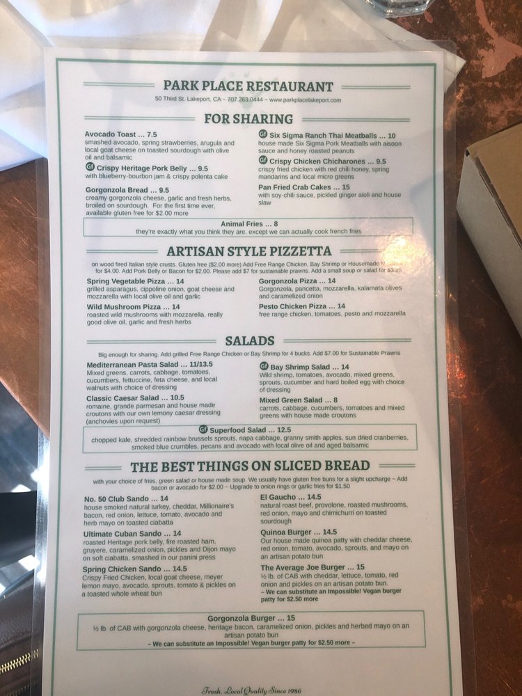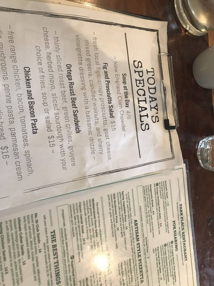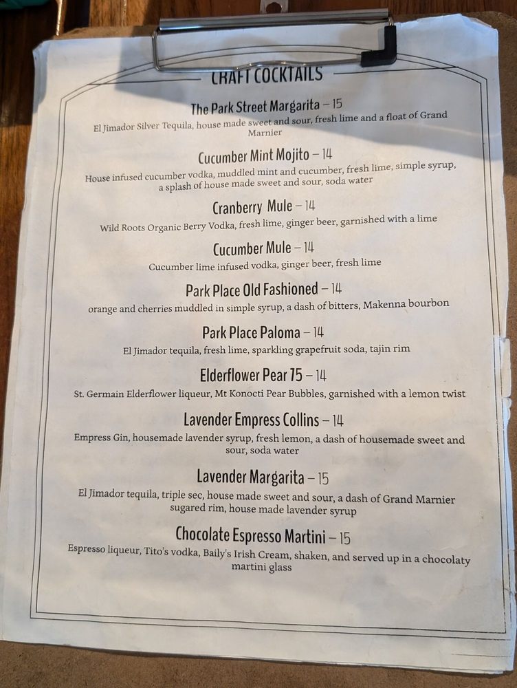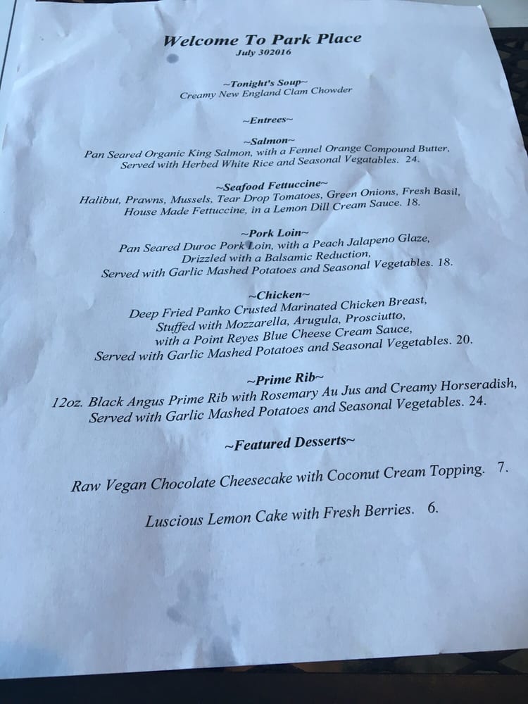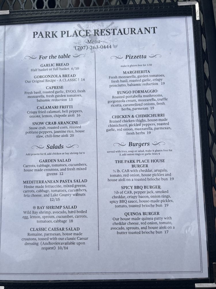 Park Place Restaurant Menu